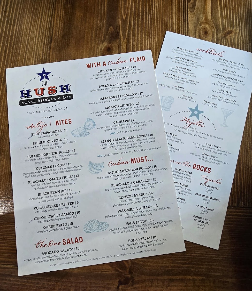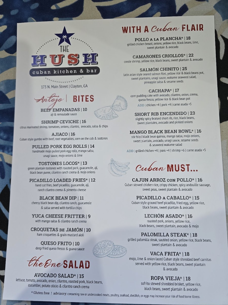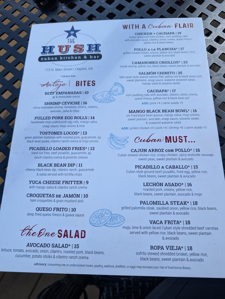 Welcome to The Hush Cuban Kitchen & Bar, a gem nestled in the heart of Clayton, GA, where the vibrant flavors of Cuba take center stage. The menu is a delightful exploration of authentic Cuban cuisine, featuring must-try dishes such as Cajun Arroz Con Pollo and the savory Ropa Vieja. Each dish is crafted with care, promising traditional tastes that evoke the spirit of Cuba.